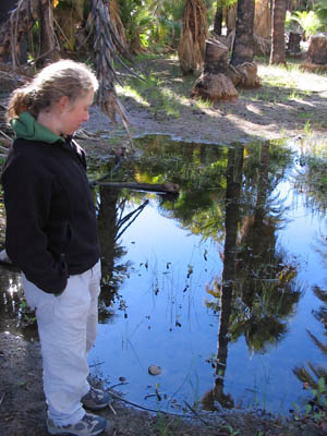 date palms rises up out of the drab desert. We camp in the trees and
